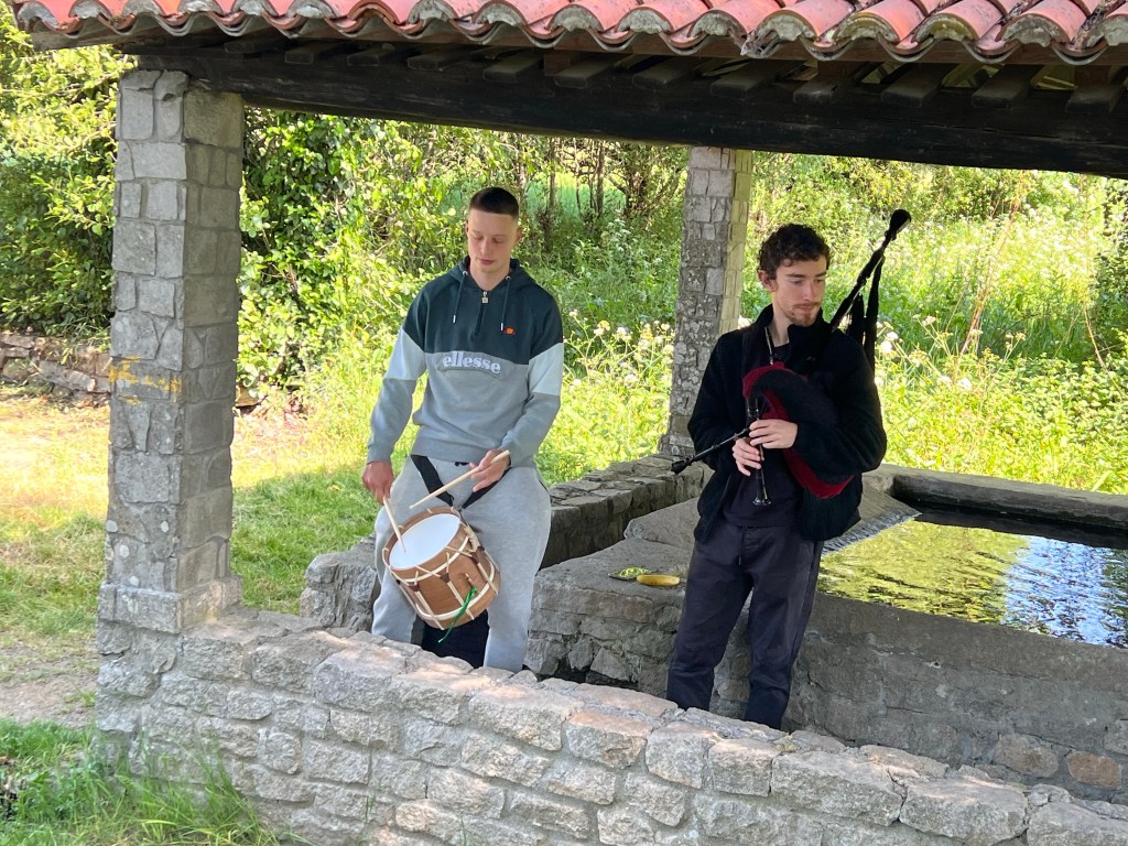 Somewhere in the last 10 km of today’s hike I heard a drum and bagpipes in the distance. It was two young men set up in a lean-to on the side of the trail. I tossed a couple of Euros into their instrument case and took the photo below.